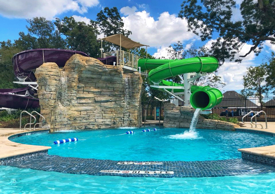 That’s right. The Veranda pool is now open for business, and our residents are already making good use of it. What are they doing? Our youngest residents enjoy an amazing kids area with a play structure (complete with a pint-sized slide) and fountains. Older kids and adults “woosh” down one of two larger slides, play a game of water volleyball or basketball, swim laps or climb the rock wall and jump right back in the water. When it’s time to take a break, there’s plenty of shaded seating and tables to picnic at.