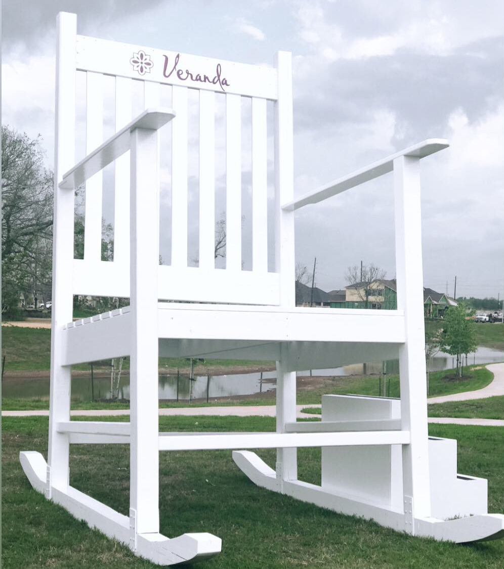 In April, we’re inviting the public to come out to Veranda and sit a spell on our giant rocking chair art installation.